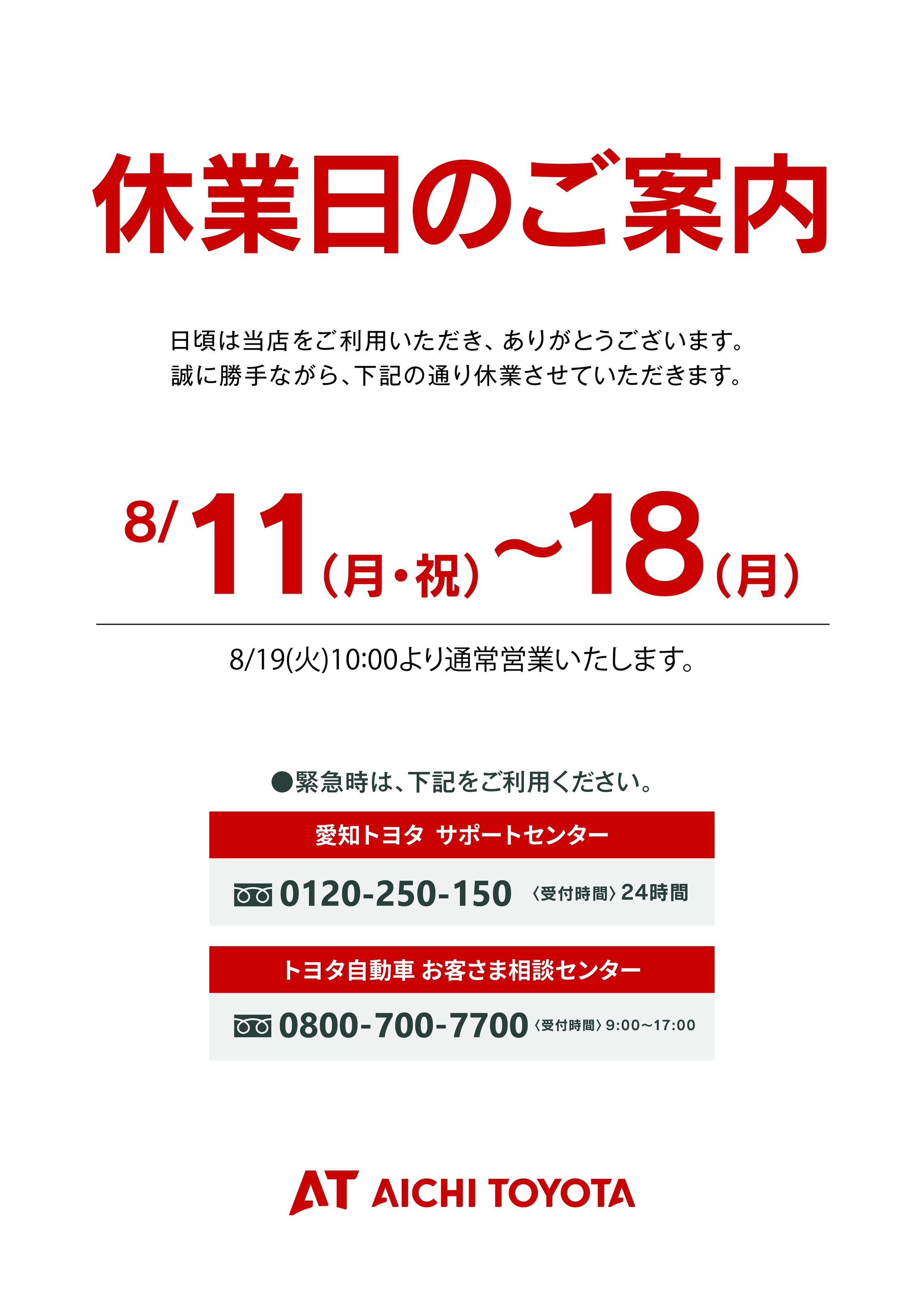 皆様にはご迷惑をおかけしますが休日のご案内と緊急連絡先のご案内をさせて頂きます。
