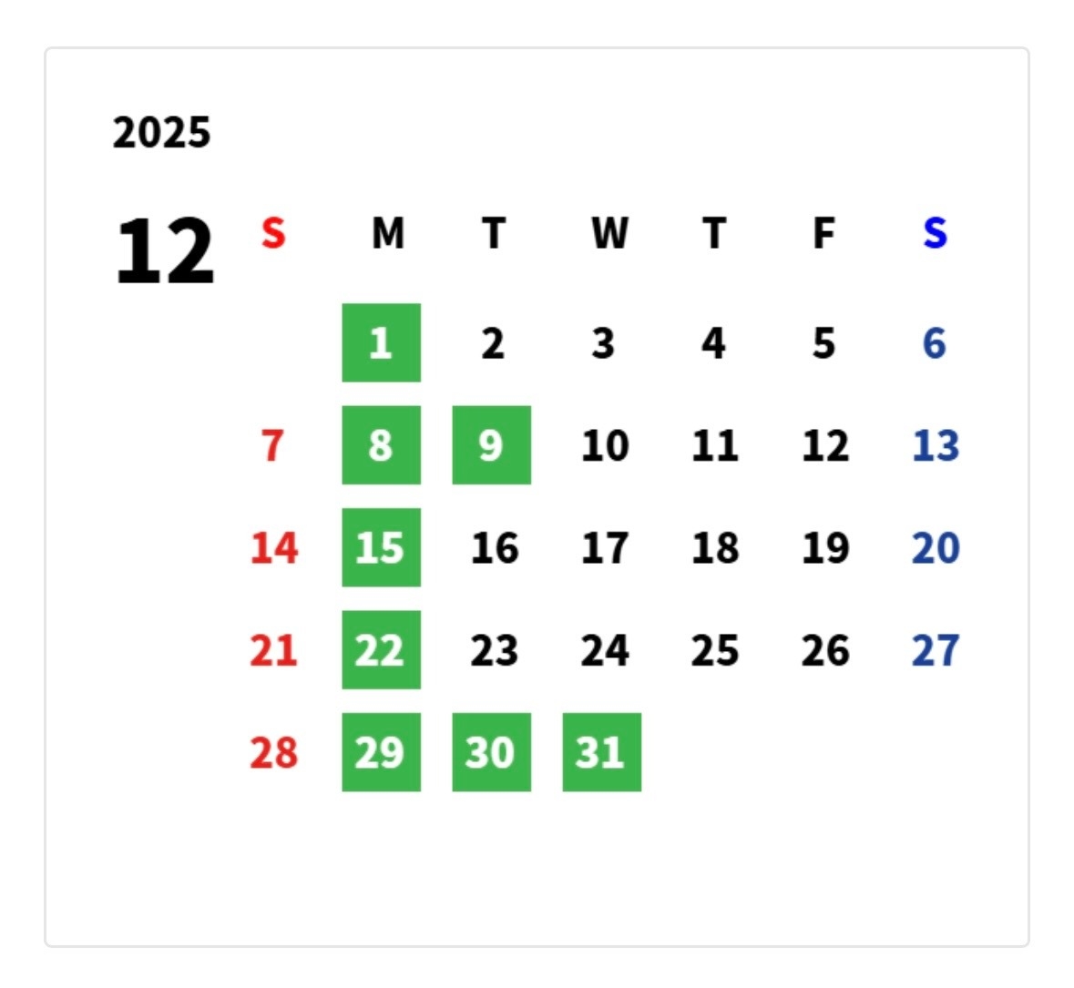 12月の営業日カレンダー