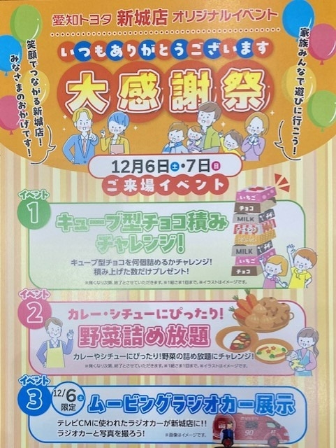 12/6.7(土日)新城店限定イベント🎄 2025.12.06 ムービングラジオカー 新城店限定イベント 野菜詰め放題 こんにちは 新城店です🎄 12/6.7(土日) 新城店限定 スタッフ企画イベント 皆さまのご来店お待ちしております 愛知トヨタ新城店 ☎0536-23-6511 前の記事へ 店舗ブログ一覧に戻る 次の記事へ