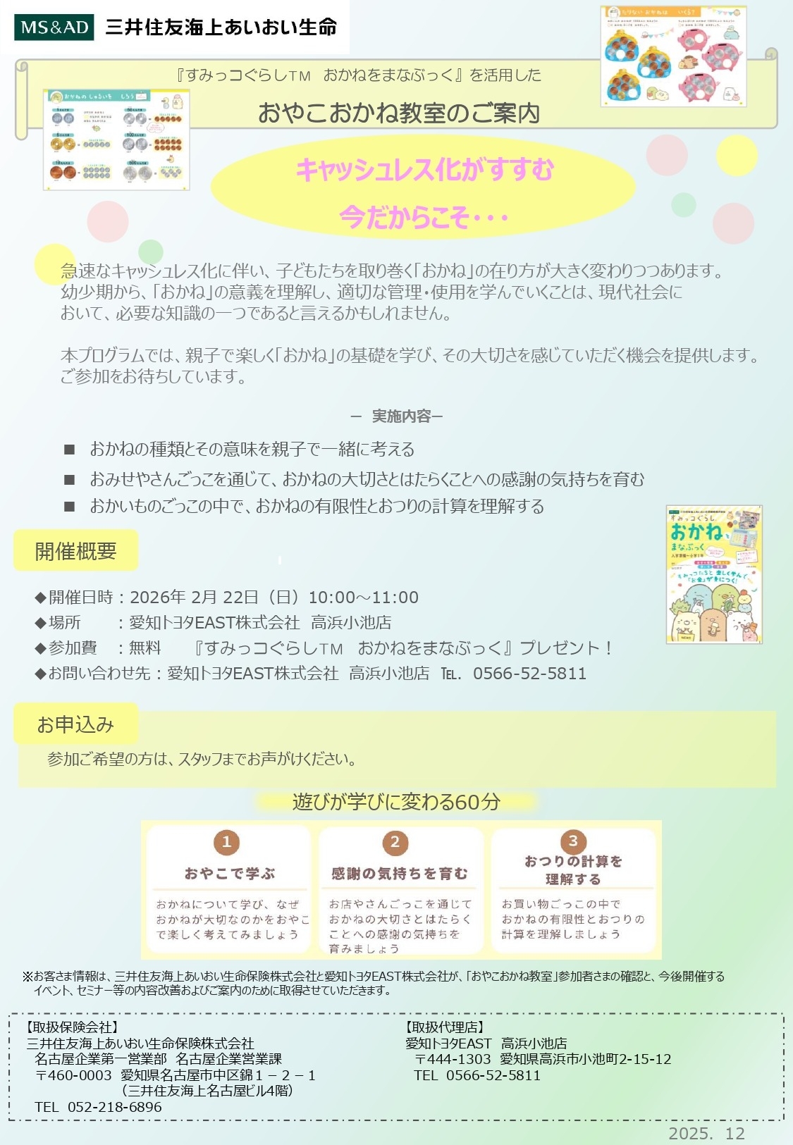 おこさま向けマネーセミナー💰 2026.02.14 小さいおこさま向けマネーセミナー開催! ぜひ親子でご参加ください! 飛び入り参加もOK! 4歳~小学校低学年のおこさま向けとなっております🌟 前の記事へ 店舗ブログ一覧に戻る 次の記事へ