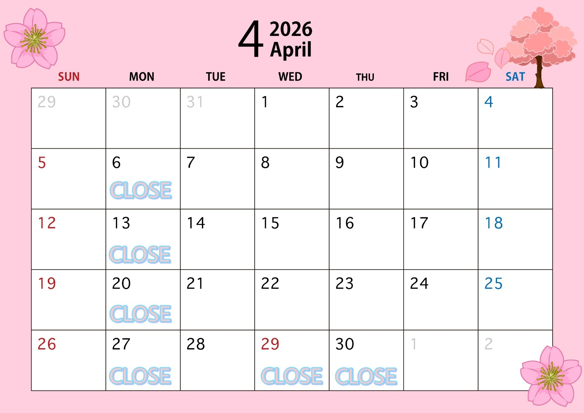 📅4月営業日のご案内📅