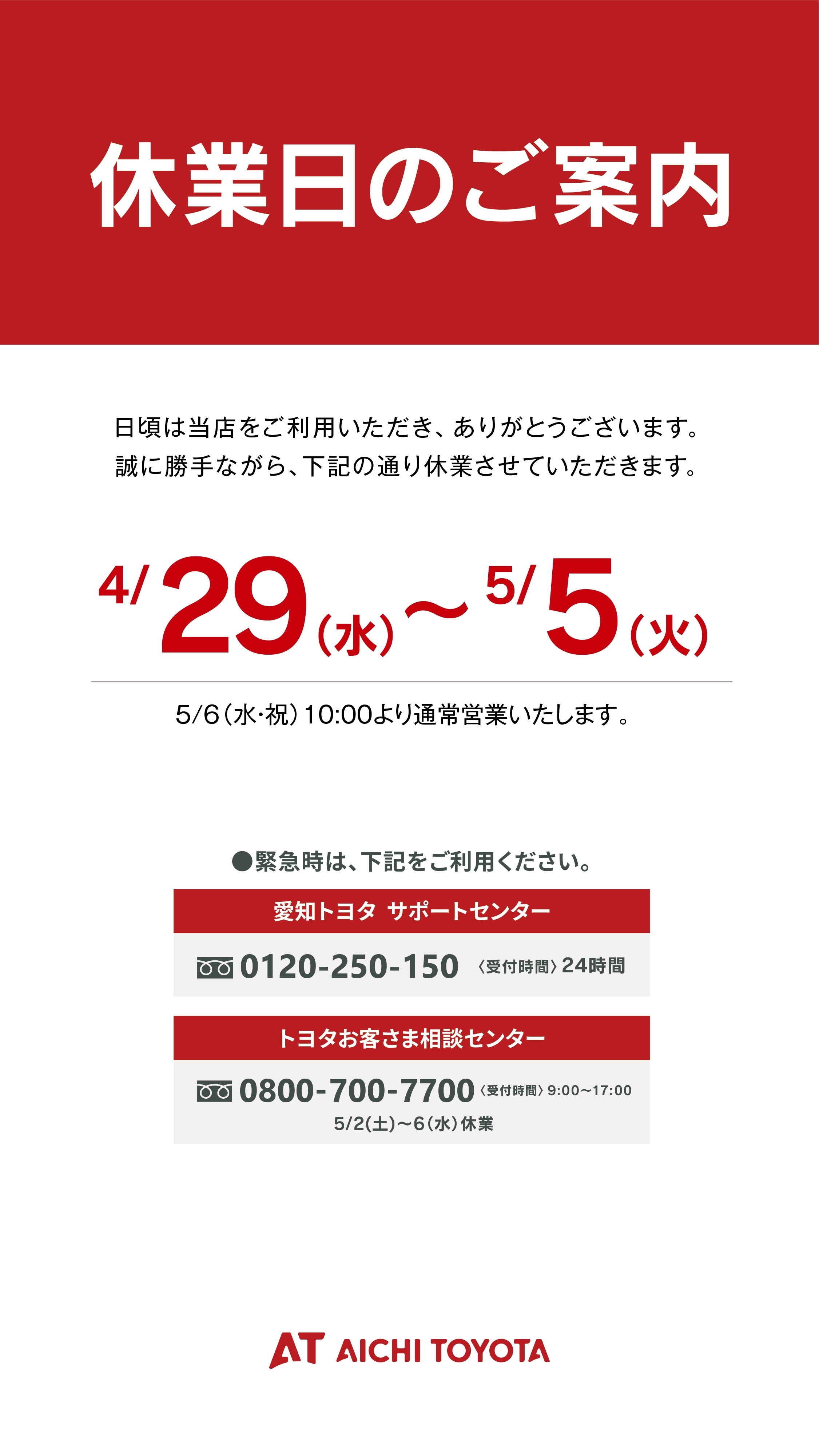 大型連休のご案内 草取り奉仕活動 2026.04.18 ゴールデンウィーク休業日のお知らせ 岡崎城北店 愛知トヨタ岡崎城北店 清掃活動 こんにちは 愛知トヨタ岡崎城北🏯店です いつもブログをご覧いただき ありがとうございます 草も元気よく生えていたので 店舗周りの清掃活動を行いました スッキリしました(^^♪ 今後も定期的にみんなで やっていきます お休みのご案内です しばらくご迷惑をおかけしますが よろしくお願いいたします 前の記事へ 店舗ブログ一覧に戻る 次の記事へ
