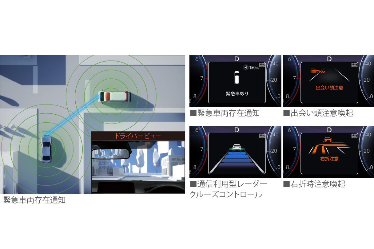クルマに搭載したセンサーでは捉えきれない見通し外のクルマや人の存在、信号情報を、クルマとクルマ、あるいは道路*2とクルマが直接通信して取得し、マルチインフォメーションディスプレイ表示やブザー音でドライバーに知らせることで安全運転を支援します。